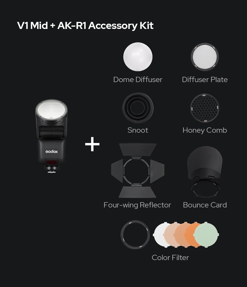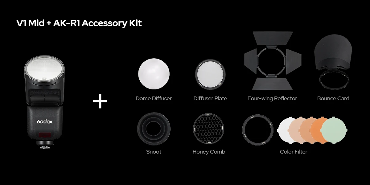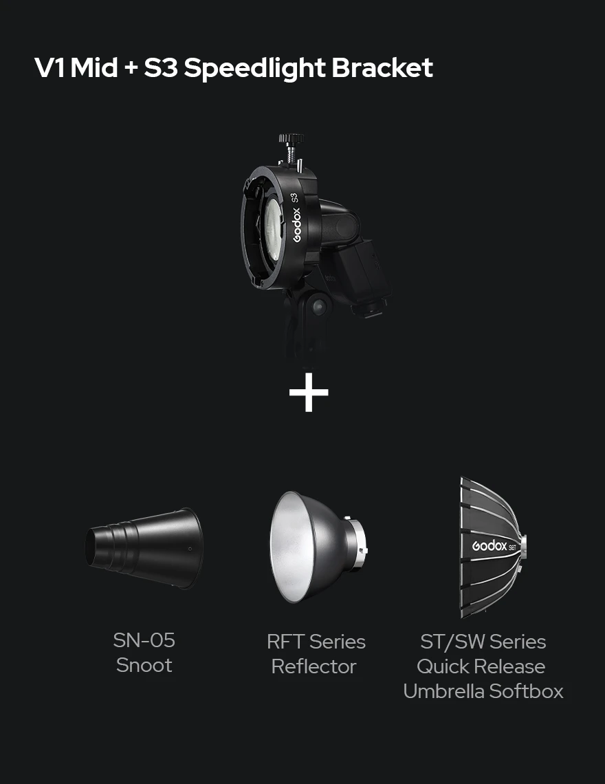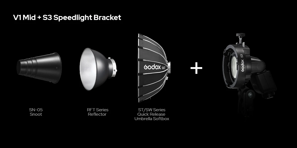 V1 mid is fully compatible with the AK-R1 Round Head Accessory Kit, enabling fast light shaping for portraits, events, and creative shoots. Paired with the S3 Speedlite Bracket, V1 mid also supports Bowens-mount modifiers, unlocking a broader range of creative lighting tools while maintaining a compact workflow.