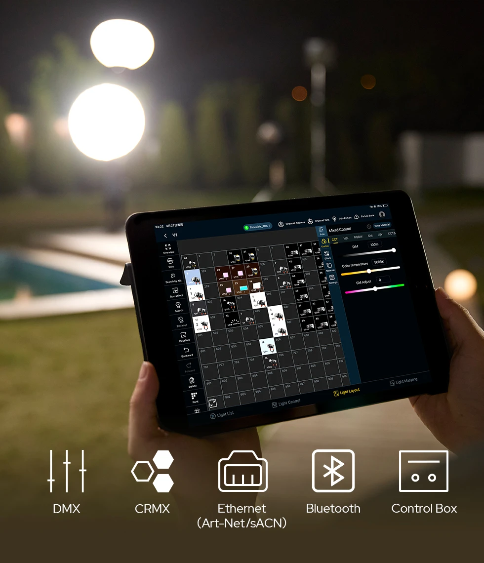 | Controlling Methods | DMX 512 controller,support RDM protocol/ LumenRadio CRMX/ Etherne/ Art-Net&sACN protocol/ Bluetooth app/controller control |