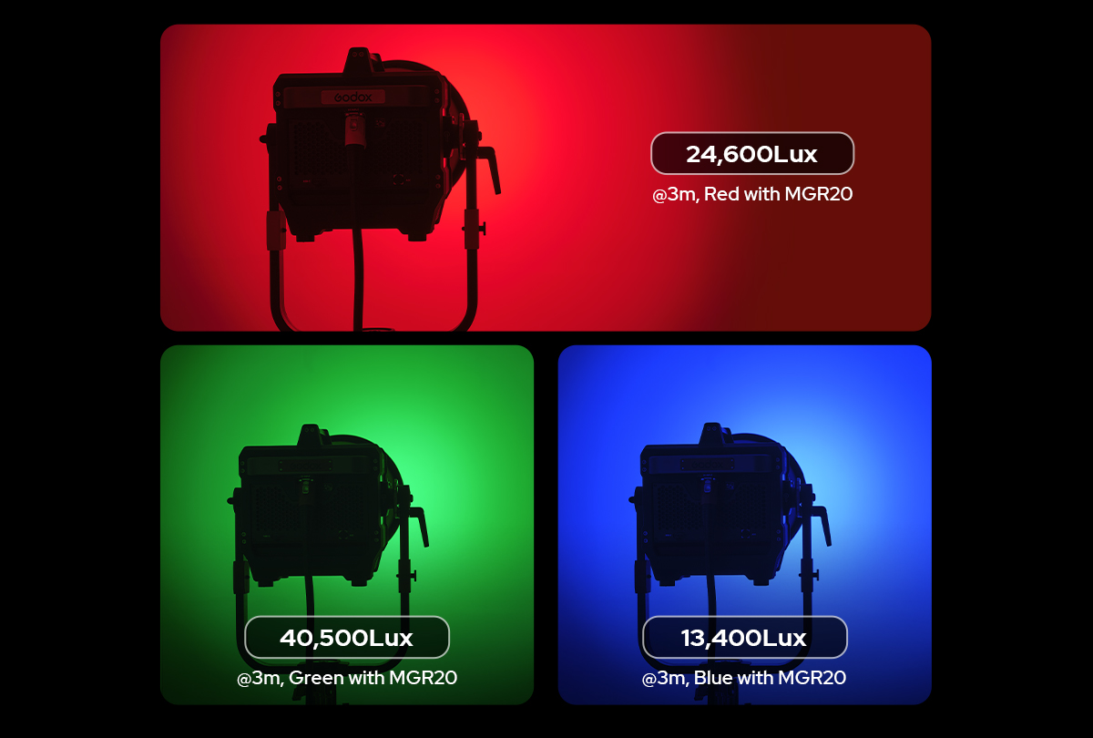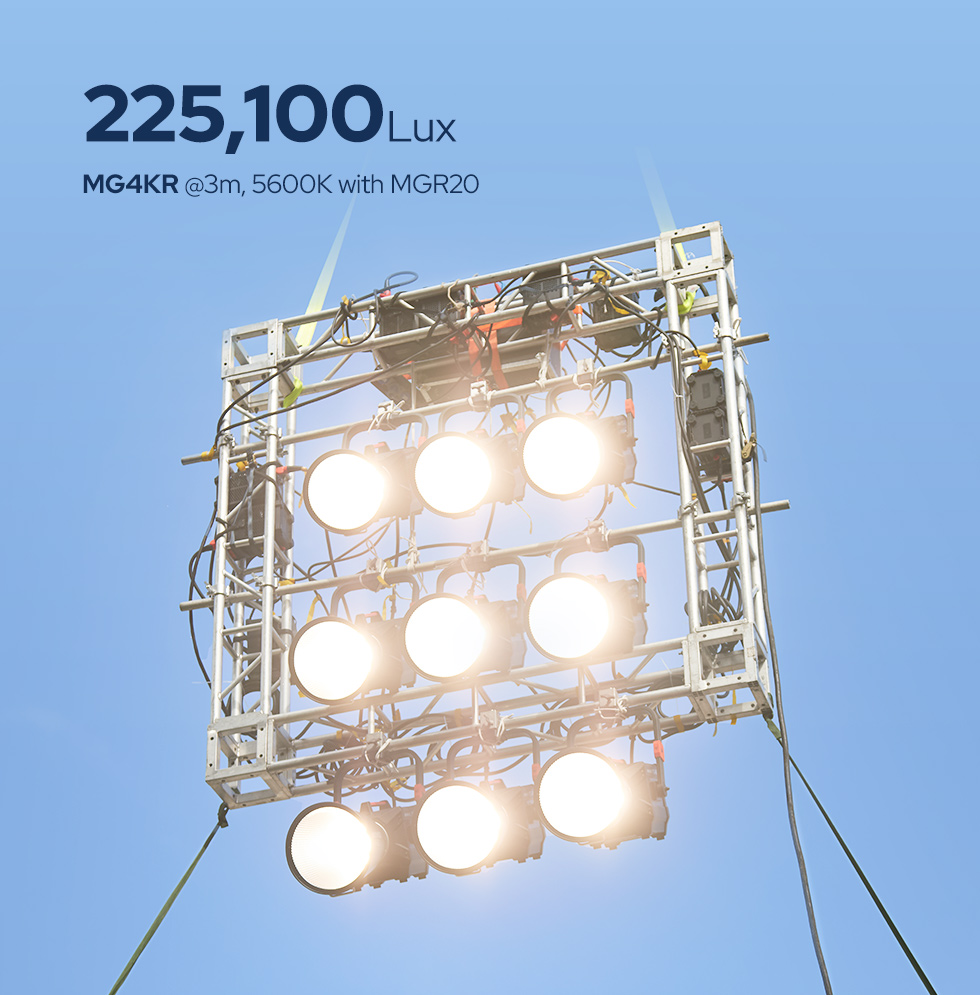 Without compromise, the MG4KR unleashes a staggering 225,100Lux @3m, 5600K with MGR20, which is comparable with the bi-color COB light in its class. Engineered using the highest luminous efficacy engine, 4K HMI white light brightness outperformed by 3100W, shines brighter and is more eco-friendly.