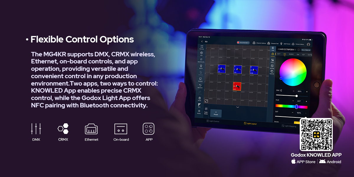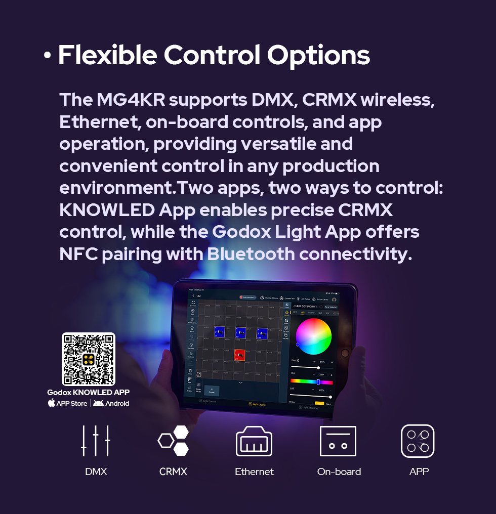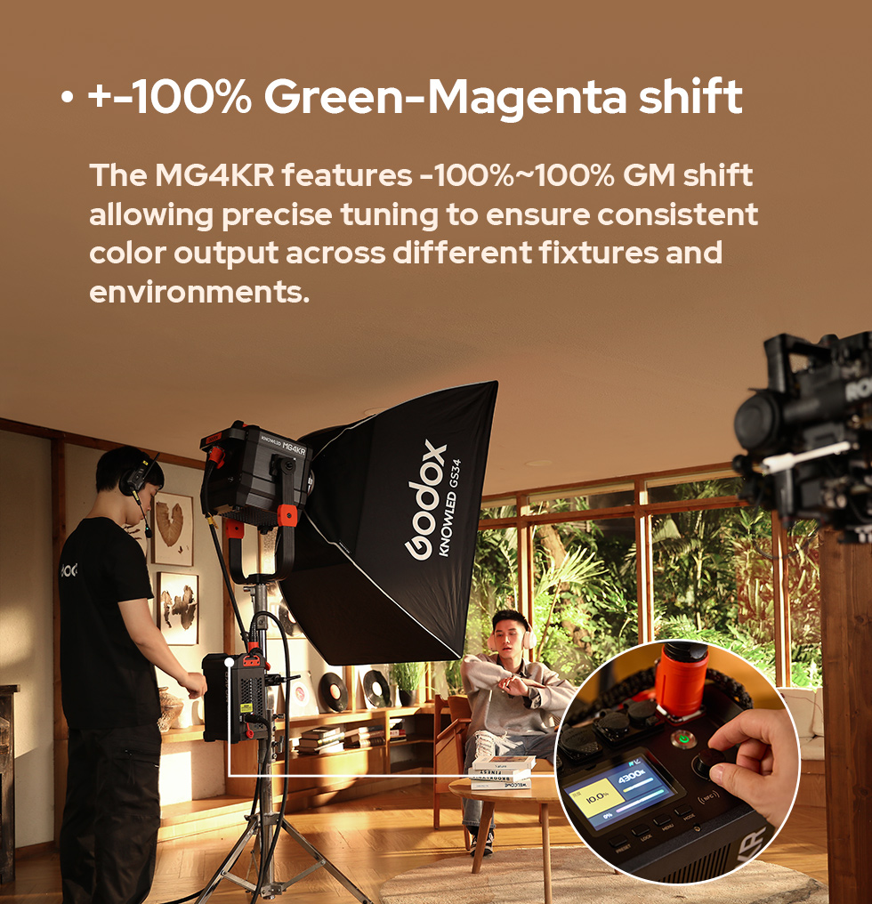 Built for professional filmmakers, the MG4KR delivers exceptional precision and creative flexibility. With accurate color reproduction, 0.1% dimming, and advanced control options, it adapts effortlessly to the most demanding production needs.