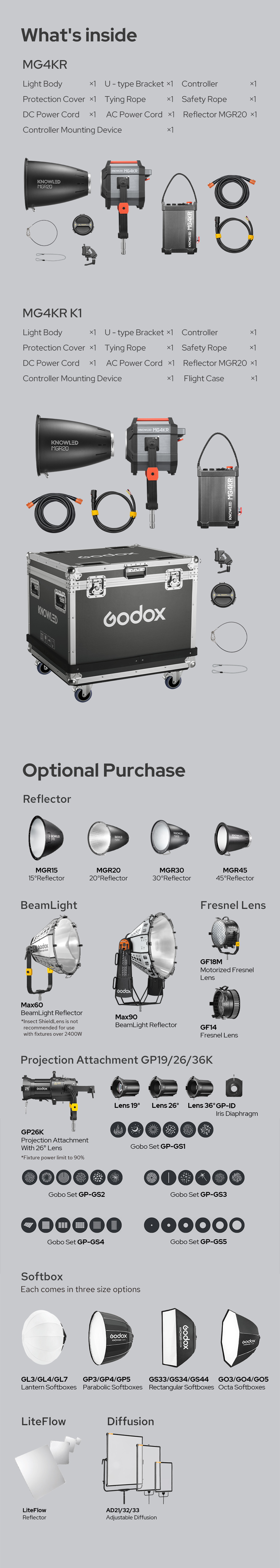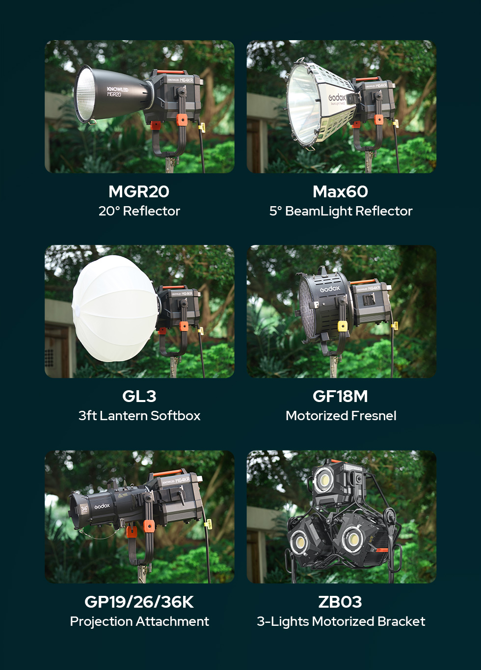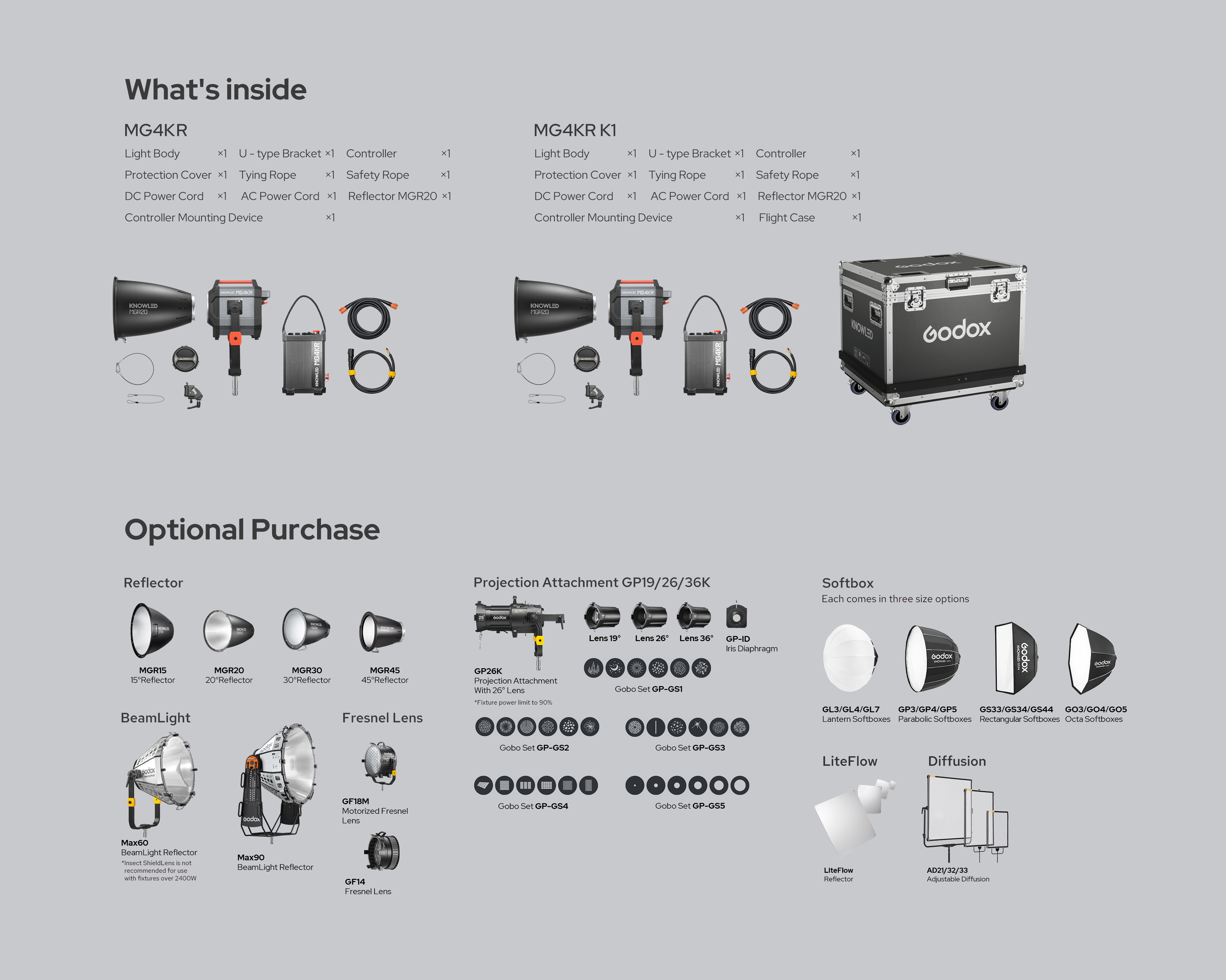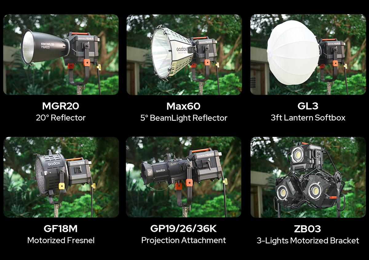 As the professional core of the KNOWLED series, the MG lineup is built around the G-Mount system, ensuring full compatibility across all models — including MG6K, MG4K, MG4KR, MG1200R, and MG1200Bi. There is no need to repurchase accessories; every G-Mount modifier and attachment works seamlessly across the entire MG family.