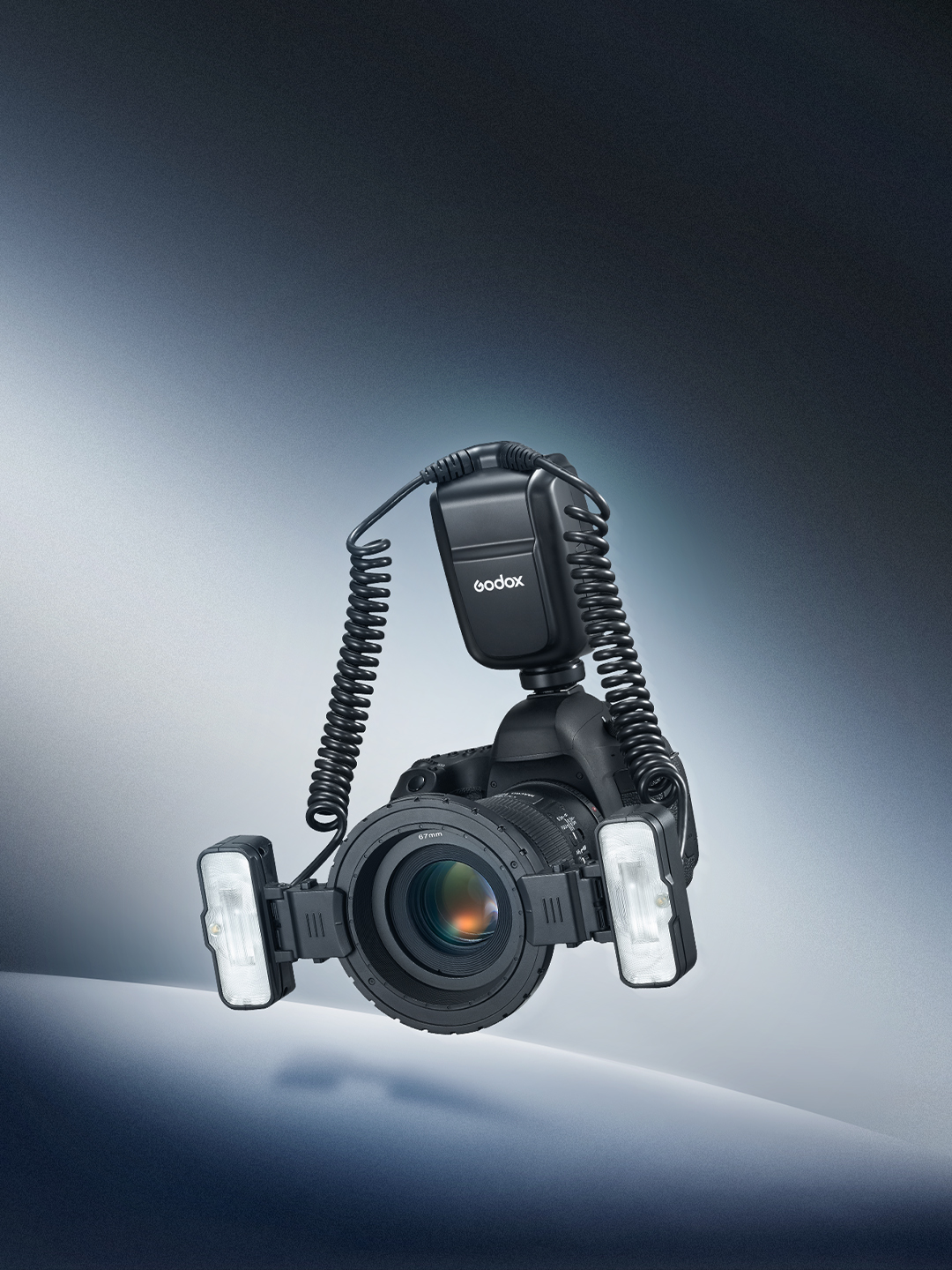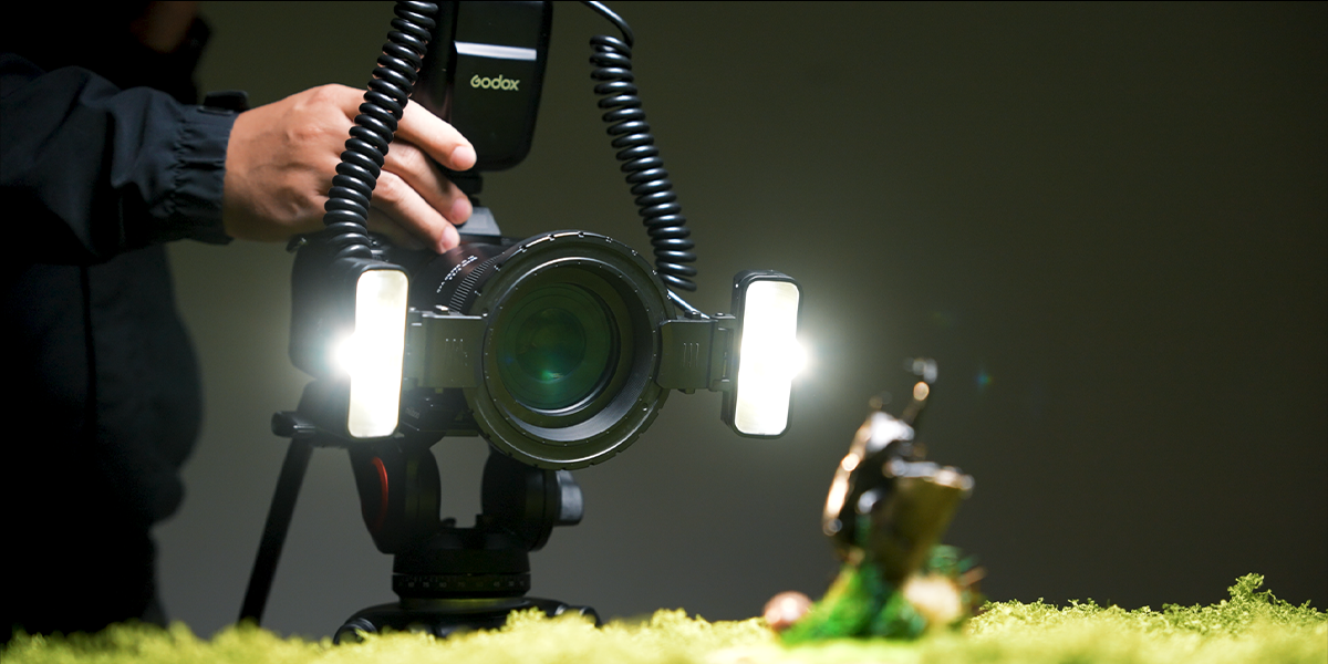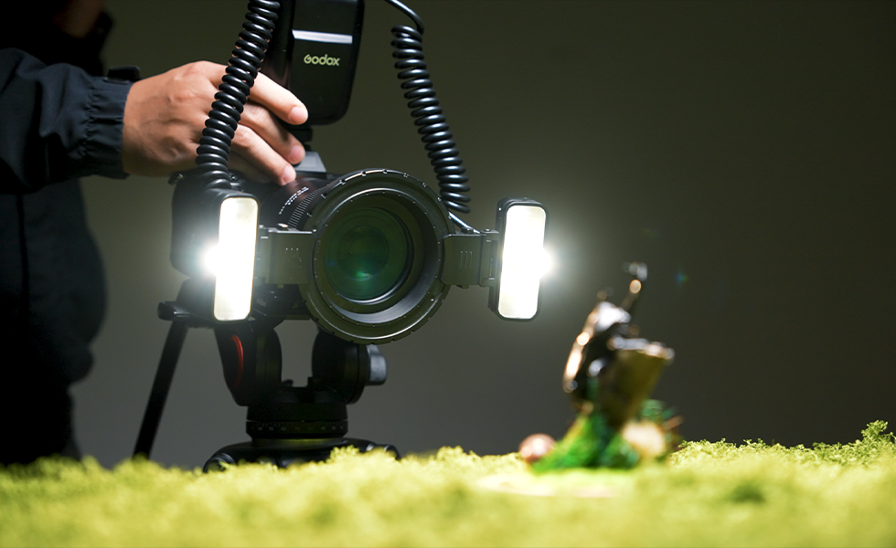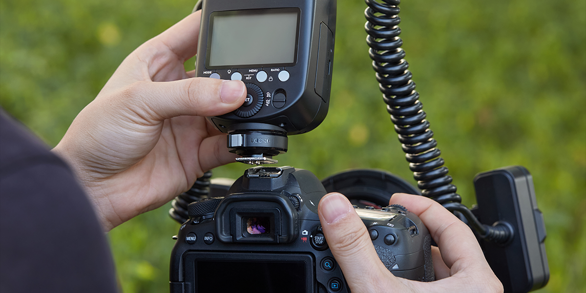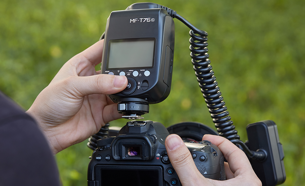 Featuring two independently adjustable flash heads with a wide 0°–150° tilt range, the MF-T76 delivers even, well-directed illumination at close distances. With the included mounting ring, each head can be easily slid and positioned to fine-tune light direction, helping achieve balanced, natural-looking macro lighting.