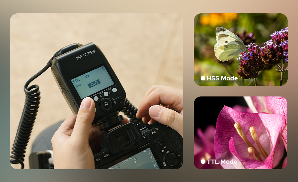 The MF-T76 supports TTL auto flash, automatically calculating optimal exposure to simplify setup and speed up shooting. High-Speed Sync (HSS) enables sharp, well-controlled images even in bright environments or when shooting with wide apertures.