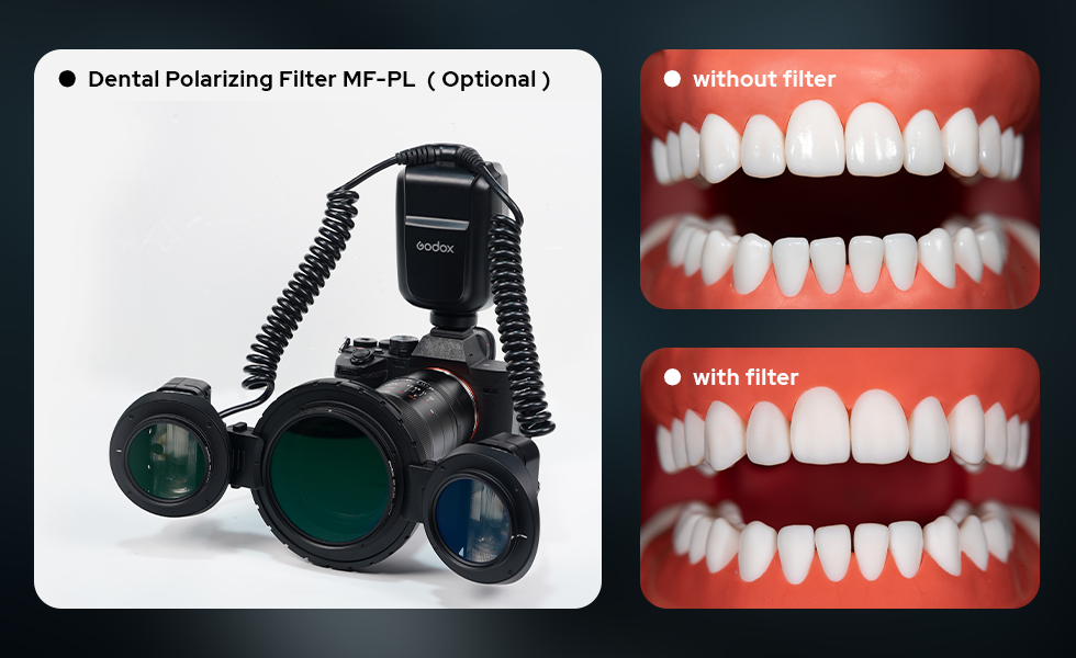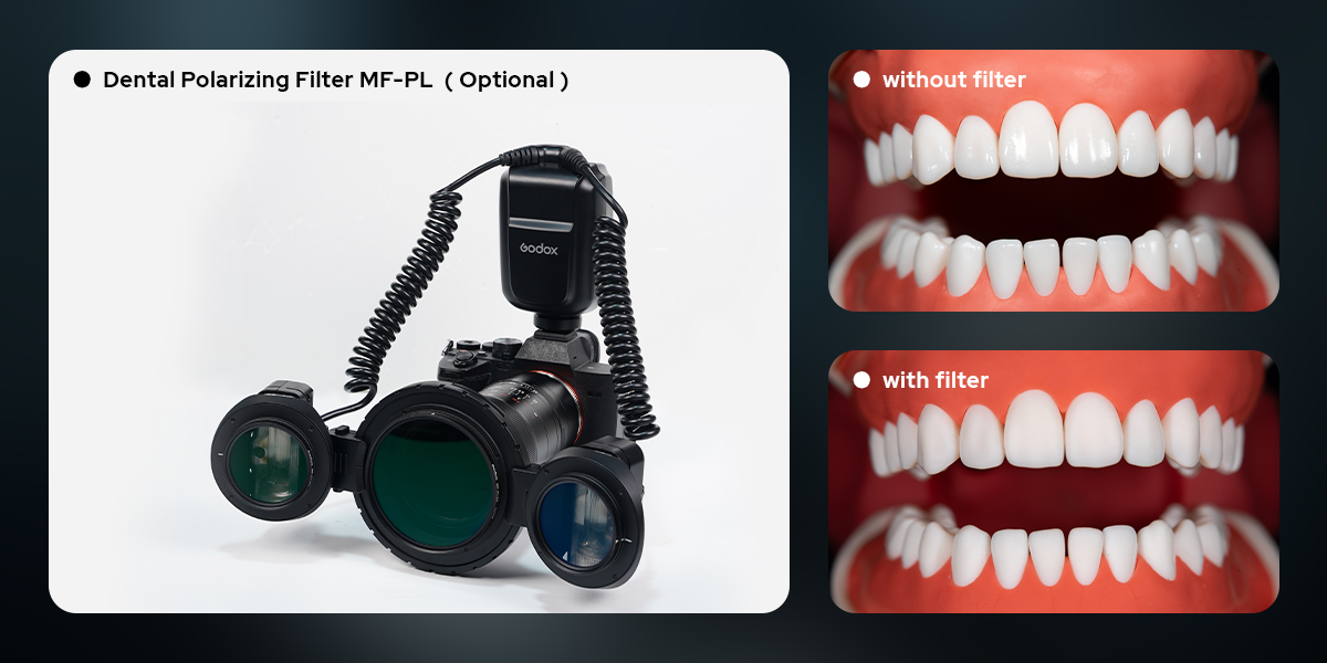The MF-PL Dental Polarizing Filter is purpose-built for dental macro photography. Designed to effectively reduce specular reflections, it helps reveal fine tooth details with greater clarity. By minimizing glare-induced color shifts, the MF-PL enables more accurate color reproduction, providing reliable visual documentation for dental diagnosis, treatment planning, and case records.