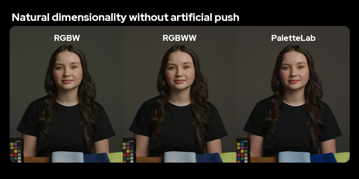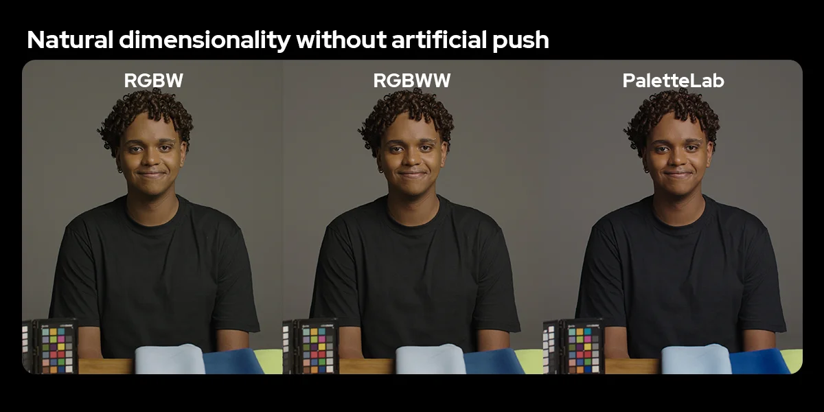 PaletteLab's full-spectrum architecture was optimized specifically for one of the most demanding tests in cinematography: human skin. With a full spectrum and optimized orange red to red to deep red range, it eliminates the muddy "LED gray" that flattens faces. Across every complexion and skin tone, color stays balanced and authentic.