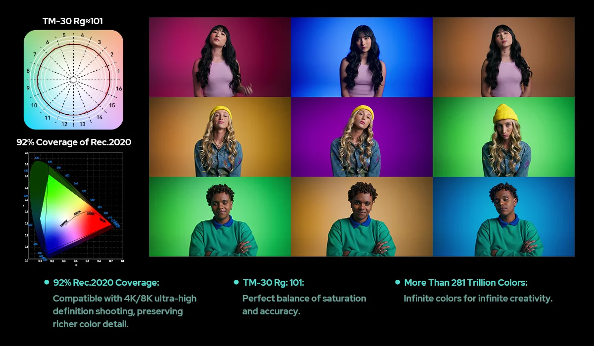 With near-perfect TM-30 RF of 97 and CRI R9 of 99, it ensures faithful accuracy and rich vibrancy across every frame, especially in skin tones. Shadows, highlights, and every hue in between are rendered naturally, allowing emotions and stories to shine through with absolute authenticity.