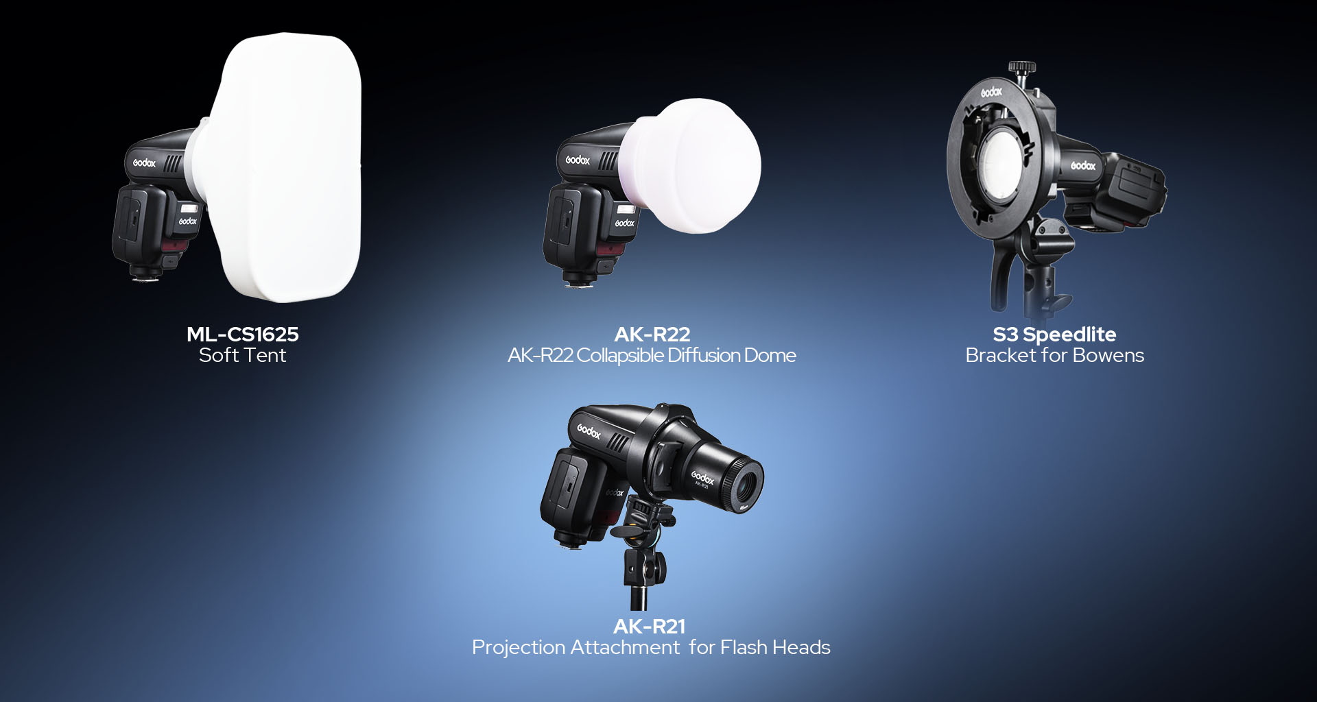 The V100 is compatible with a broad range of Godox accessories, including the AK-R1 Accessory Kit for Round Flash Heads, AK-R21 Projection Attachment, AK-R22 Collapsible Diffusion Dome, and the S3 Speedlite Bracket for Bowens, among others. Whether you're fine-tuning light, exploring creative effects, or expanding functionality, the V100 is designed to meet every need.