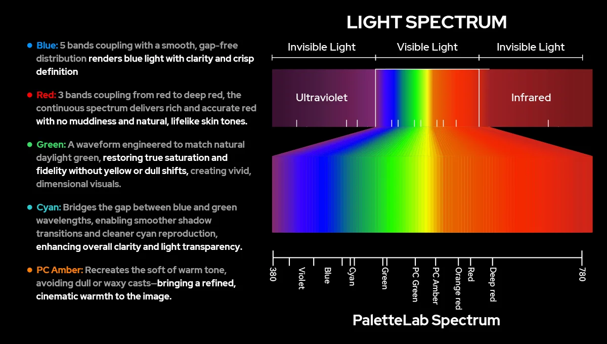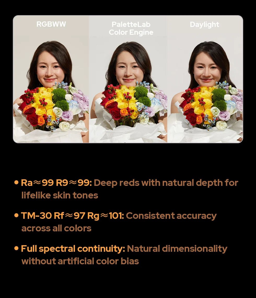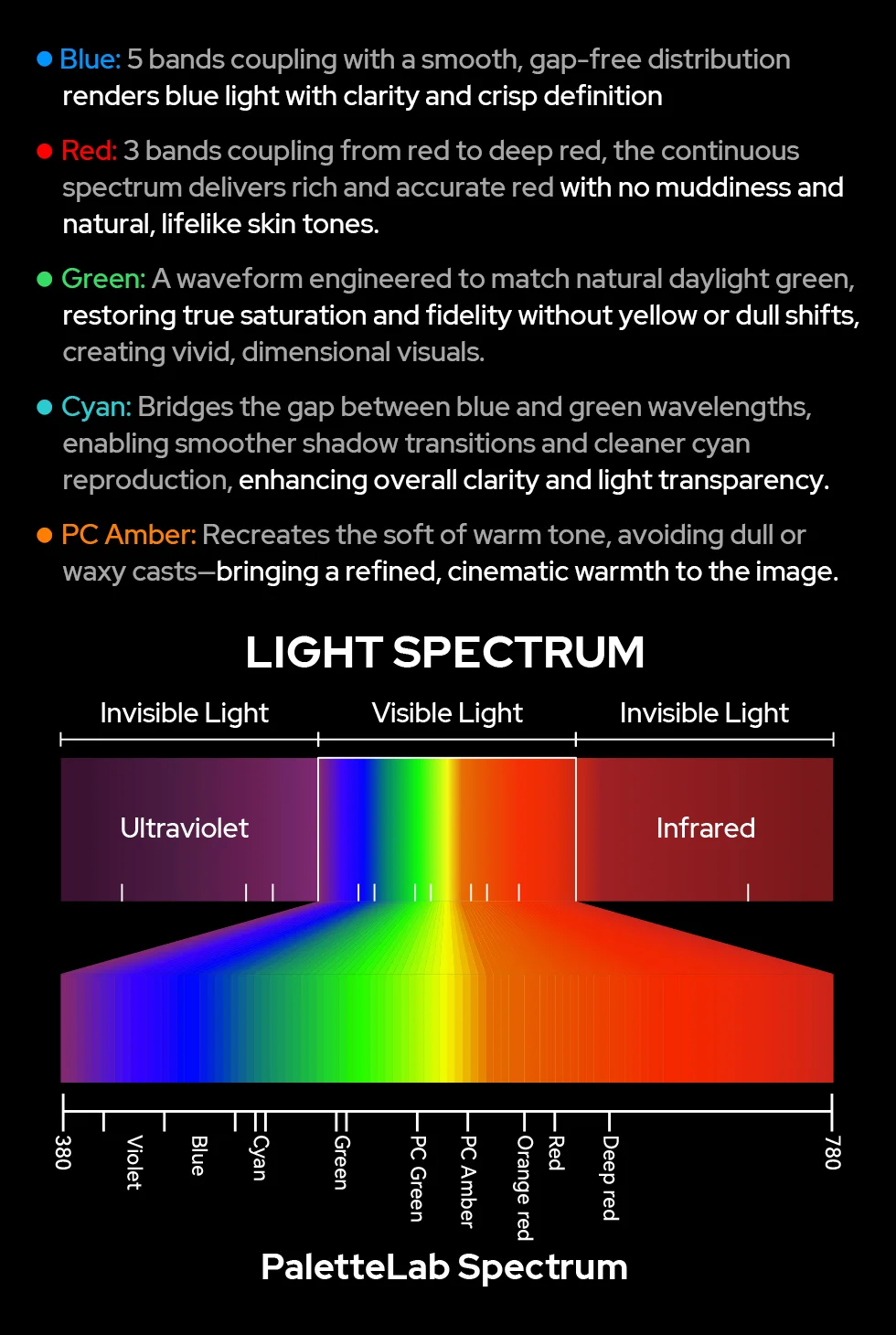 Aiming for uncompromised white light, the PaletteLab optimizes the continuity across the full visible spectrum through Multispectral Coupling Technology. By refining transitions from blue to cyan and from orange red to deep red, PaletteLab eliminates spectral gaps, delivering exceptional spectrum continuity that translates directly into cleaner images, truer colors, and more lifelike results.
