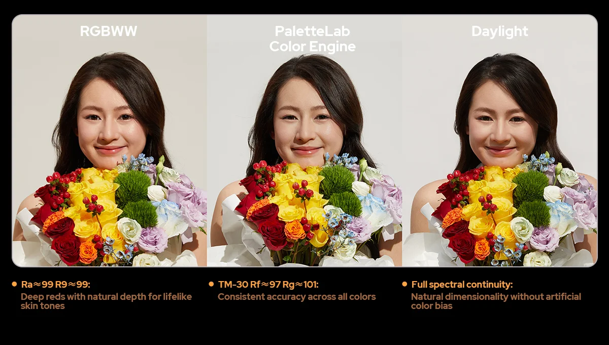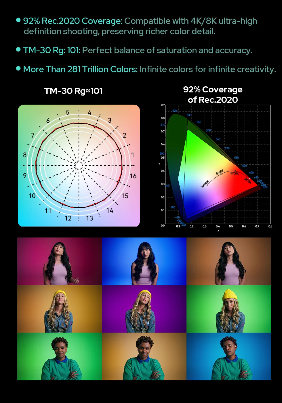 With near-perfect TM-30 RF of 97 and CRI R9 of 99, it ensures faithful accuracy and rich vibrancy across every frame, especially in skin tones. Shadows, highlights, and every hue in between are rendered naturally, allowing emotions and stories to shine through with absolute authenticity.