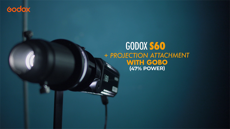 Even though we're just focusing on lighting the face, looking at your background is also very important. So for this, we have the Godox S60 and a lens projection attachment. It's casting a beam across this wall, behind the subject, just to give the shot a little more interest. I even added a Godox gobo with a window frame to cast a shadow of a window onto the wall.