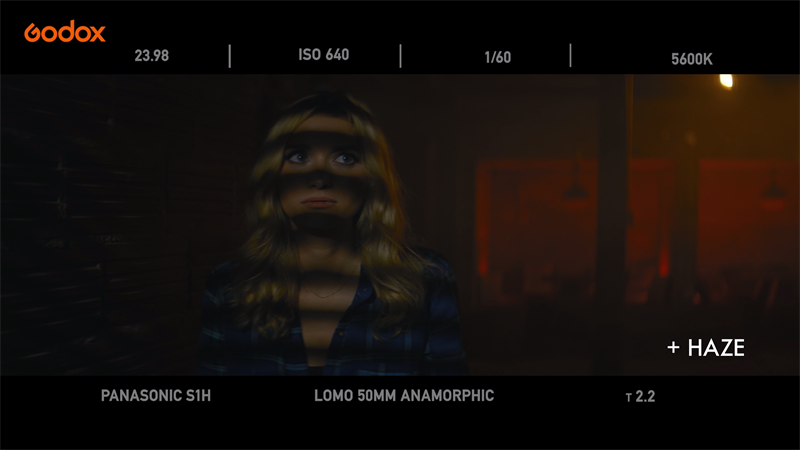 To create the illusion of our character looking out a window with very thin blinds, we used the Godox S60 with the lens projection attachment. I inserted a gobo with very thin blinds to create the shadow effect that we needed. The idea here was to have her eyes right in between the blinds as if she were looking outside.
