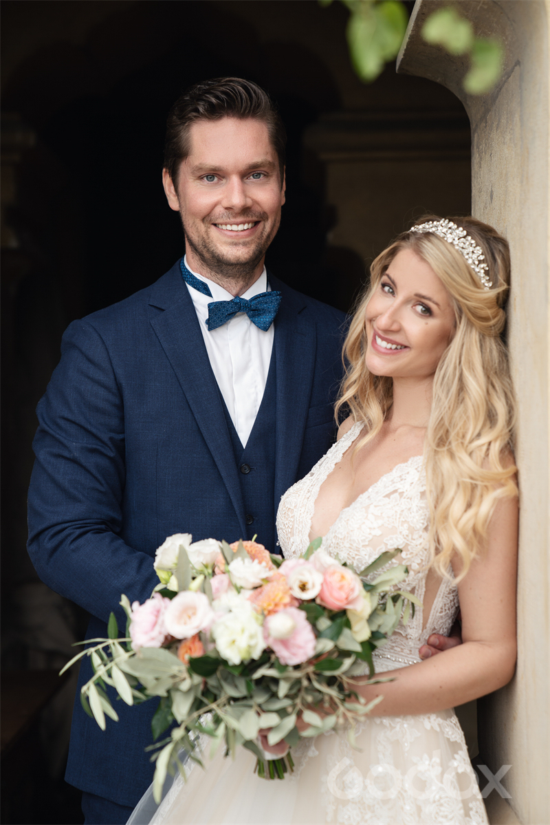 With these classic posed portraits, I have positioned the light camera left at 45 degrees. This is because I noticed that the bride tends to favour looking in that direction, showing the left side of her face. By placing the light camera left, the light falls fairly straight on to her face in a flattering beauty style lighting pattern. As the groom is turned towards the bride or is facing camera, he gets the more “rugged” Rembrandt lighting.
